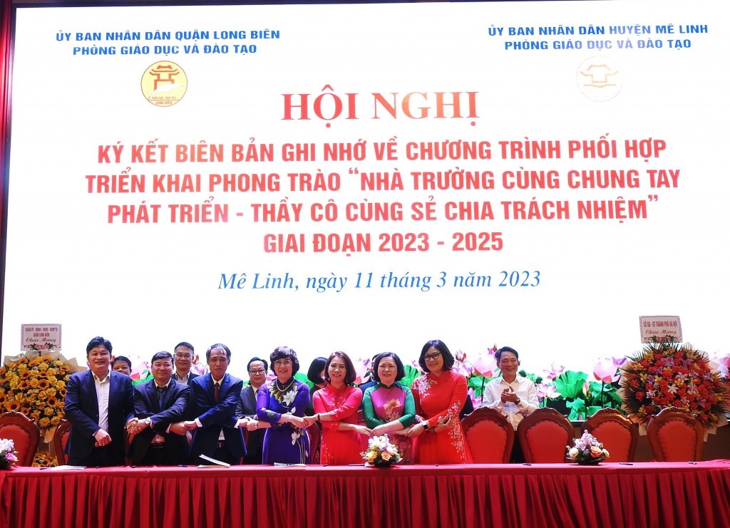 Tại hội nghị ký kết biên bản về phối hợp triển khai kế hoạch “Nhà trường cùng chung tay phát triển, thầy cô cùng sẻ chia trách nhiệm” giai đoạn 2022-2025, Trưởng phòng Giáo dục và Đào tạo, hiệu trưởng 32 trường mầm non, tiểu học, trung học cơ sở của huyện Mê Linh và quận Long Biên đã tổ chức ký bản ghi nhớ về chương trình kết nghĩa cùng chung tay phát triển giai đoạn 2023-2025.
