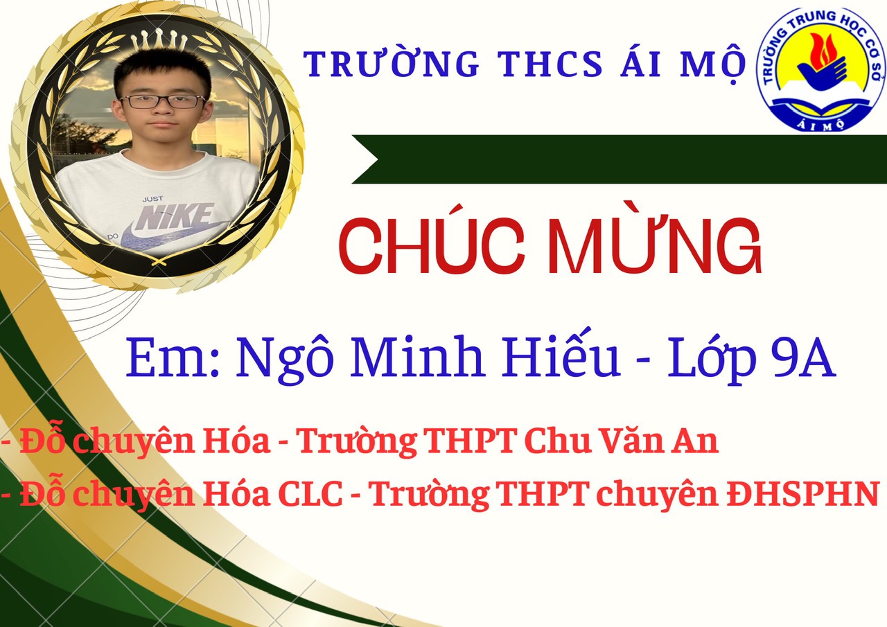 Ngô Minh Hiếu là một cậu học trò có vóc dáng nhỏ bé nhưng vô cùng nhanh nhẹn, thông minh, với thành tích đáng nể. Trong kỳ thi vào THPT, em đã đỗ nguyện vọng 1- trường THPT Phan Đình Phùng với số điểm 45,75 điểm và đỗ chuyên Hóa trường THPT Chu Văn An với số điểm 38,9 điểm, cao hơn điểm chuẩn 3,85 điểm. Trong bốn năm học tại trường THCS Ái Mộ, Ngô Minh Hiếu luôn nỗ lực không ngừng, luôn là học sinh giỏi trong tốp đầu của lớp. Em tự tin ở tất cả các môn học, trên lớp em tập trung nghe thầy cô giảng bài, cố gắng làm hết những bài tập trong sách giáo khoa, đặc biệt là những bài khó. Những gì không hiểu, em mạnh dạn trao đổi với thầy cô, bạn bè. Đặc biệt em có niềm đam mê với Khoa học kĩ thuật, nhất là môn Hóa Học. Năm học lớp 8, lớp 9 em đều giành được giải nhì cấp Quận cuộc thi nghiên cứu Khoa Học Kĩ Thuật. Năm học lớp 9 em đạt được giải ba cấp Quận môn Hóa học.