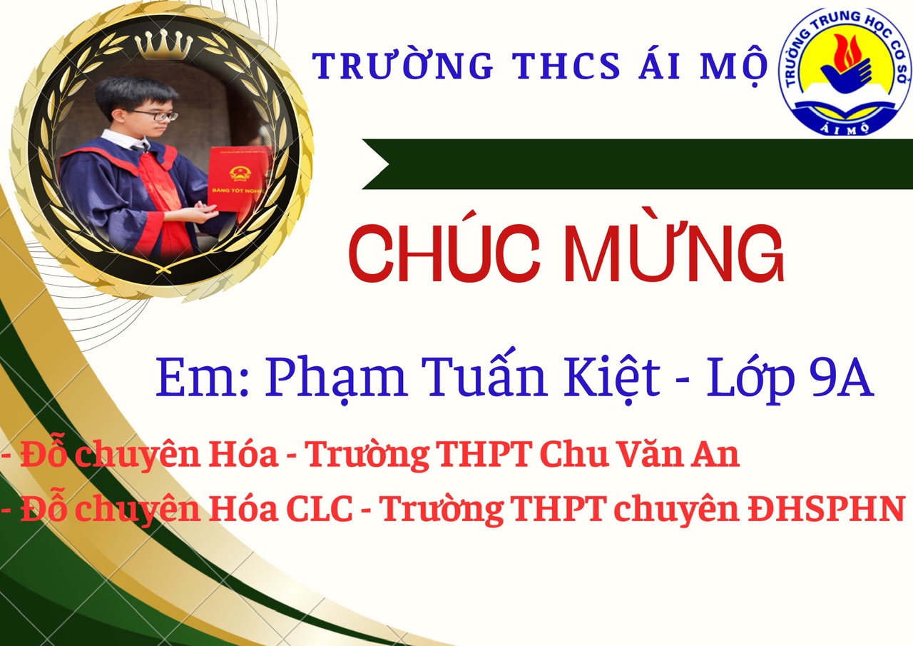 Phạm Tuấn Kiệt là một trong những học sinh xuất sắc đã ghi tên mình vào bảng vàng thành tích của trường THCS Ái Mộ. Kết quả của Kiệt hôm nay là niềm tự hào to lớn của em và gia đình cũng như của nhà trường. Mong rằng, trong những năm học sắp tới, em sẽ luôn phát huy được tinh thần học tập xuất sắc và gặt hái được nhiều thành công.