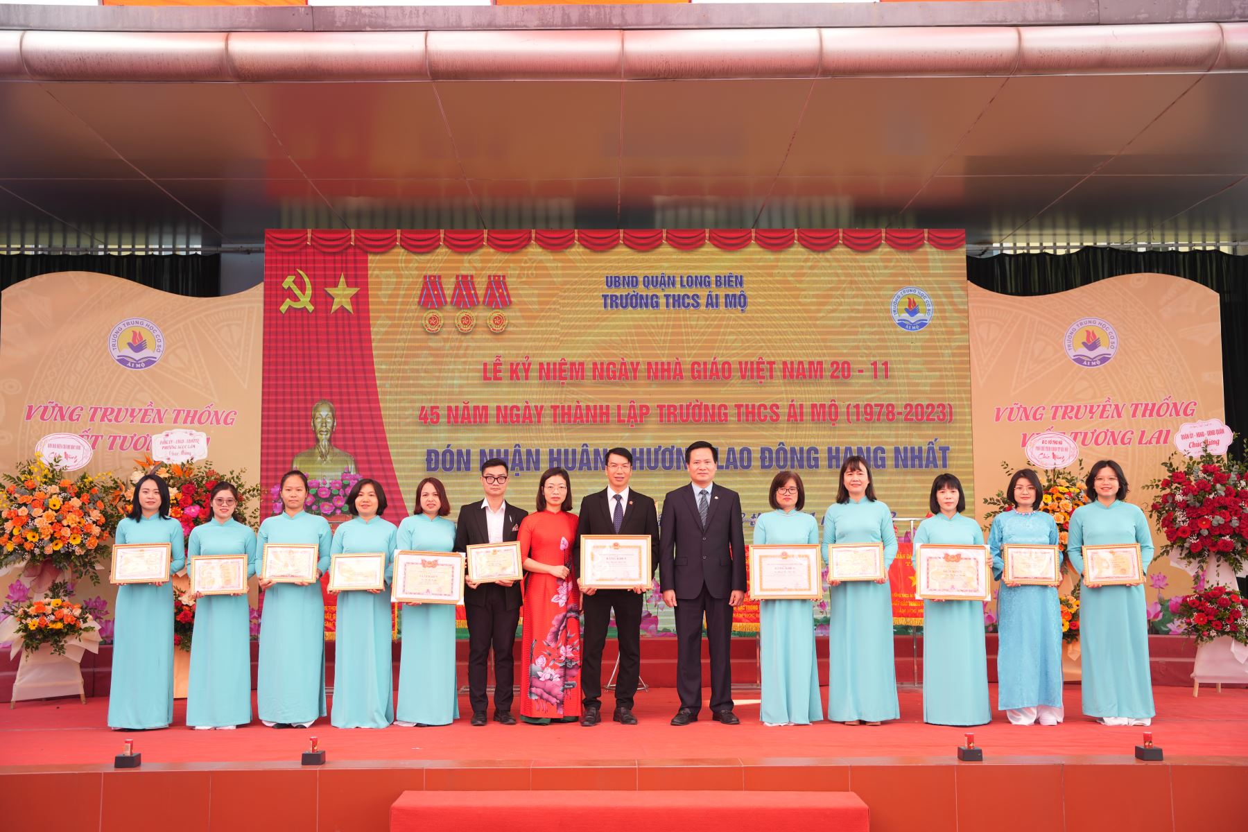 Để chúc mừng những thành tích của thầy và trò nhà trường đã đạt được và dành những tình cảm trân trọng nhất tới các thế hệ nhà giáo tại trường THCS Ái Mộ vì những cống hiến lớn lao cho Ngành Giáo dục & Đào tạo quận Long Biên nói riêng và Ngành Giáo dục đào tạo nước nhà nói chung, đại diện lãnh đạo thành phố, các đ/c Lãnh đạo Quận uỷ - HĐND- UBND - UBMTTQ quận Long Biên, các tổ chức, đoàn thể trên địa bàn phường đều có lẵng hoa tươi thắm chúc mừng thành tích nhà thường.