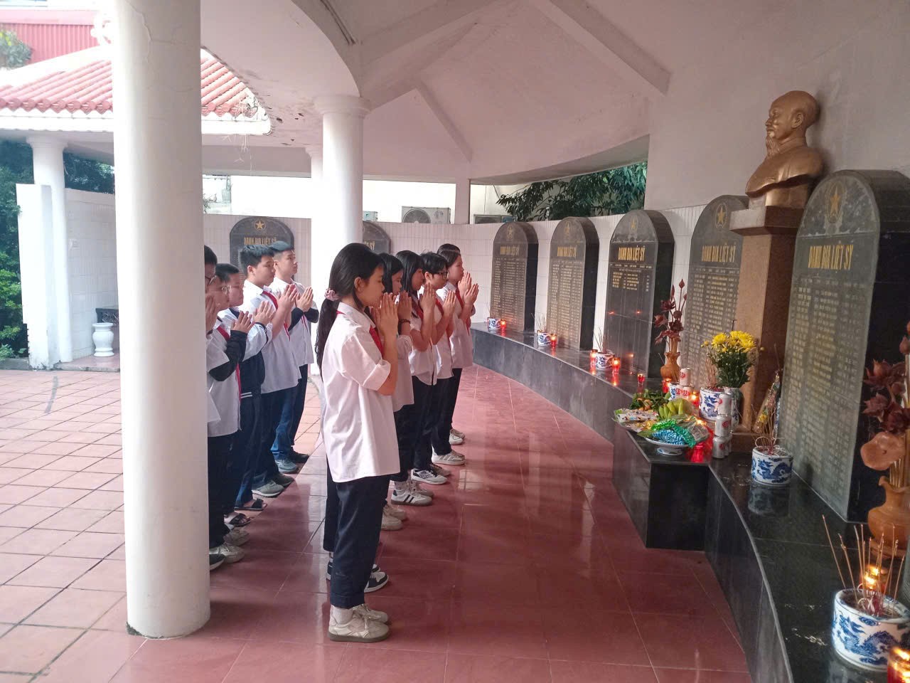 Trước khi tổ chức lao động, thầy trò Chi đội 7A3 đã tập trung viếng và thắp hương tri ân trước tượng đài Tổ quốc ghi công trong khuôn viên nghĩa trang.