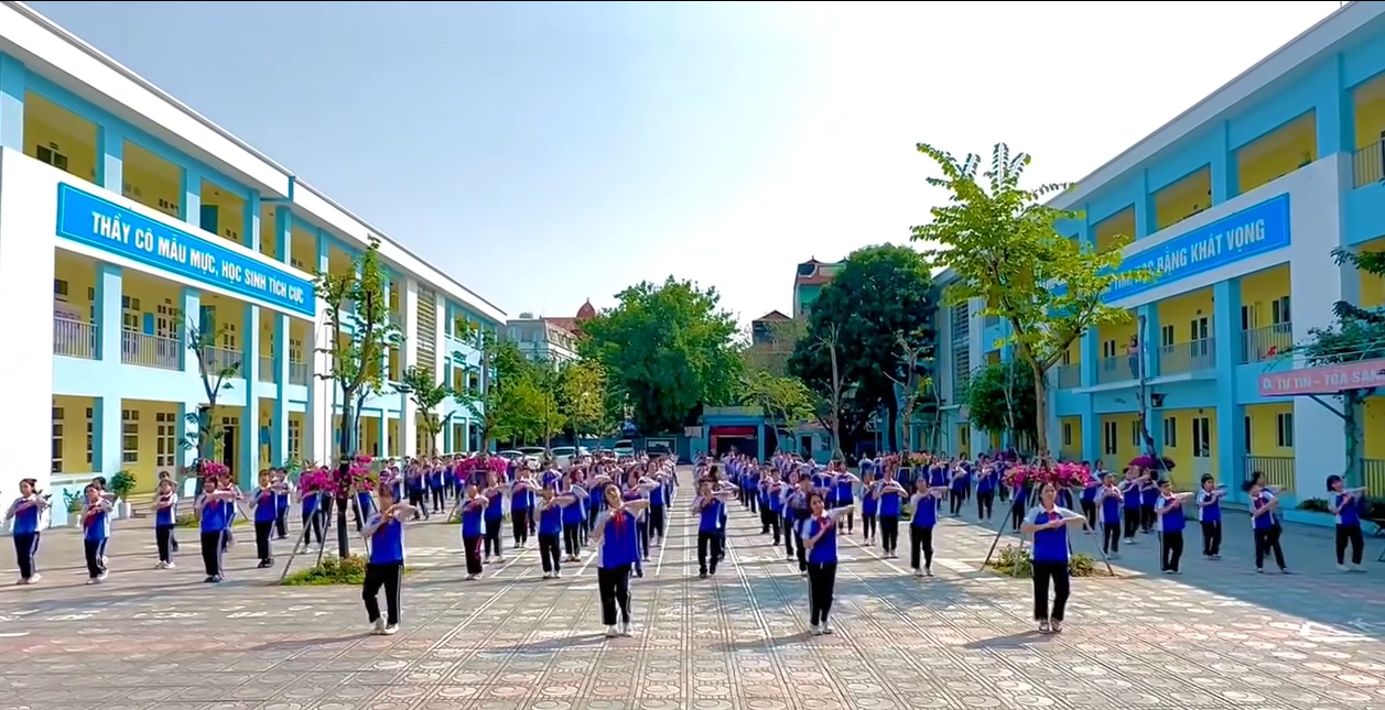 Không khí tập luyện hăng say chuẩn bị cho tiết mục đồng diễn của các em học sinh trường THCS Ái Mộ