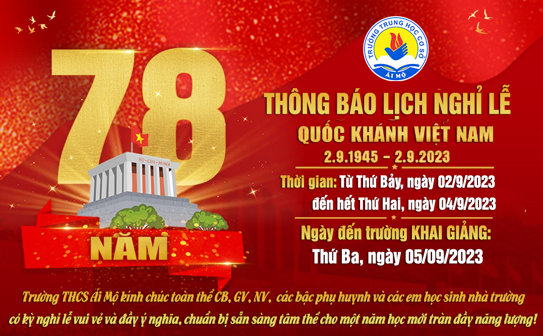 ⏰ NGÀY NGHỈ: Từ Thứ Bảy, ngày 02/9/2023 đến hết Thứ Hai, ngày 04/9/2023. 🏫 Ngày đến trường KHAI GIẢNG: Thứ Ba, ngày 05/09/2023. 🌺 Trường THCS Ái Mộ kính chúc toàn thể CB, GV, NV, các bậc phụ huynh và các em học sinh nhà trường có kỳ nghỉ lễ vui vẻ và đầy ý nghĩa, chuẩn bị sẵn sàng tâm thế cho một năm học mới tràn đầy năng lượng!