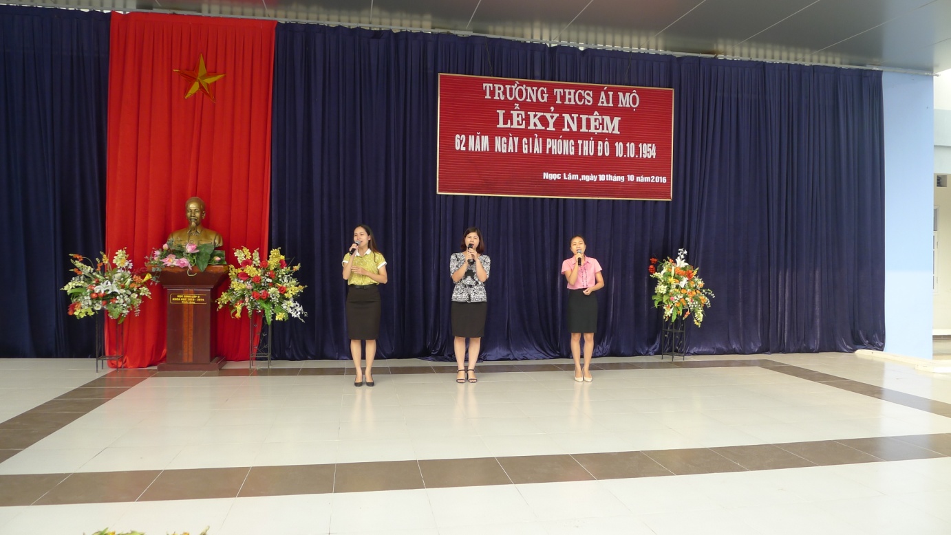 Hòa chung không khí thi đua tưng bừng phấn khởi cùng cả nước chào mừng kỉ niệm 62 năm ngày giải phóng Thủ đô (10/10/1954 - 10/10/2016), sáng thứ Hai ngày 10/10/2016 thầy và trò trường THCS Ái Mộ đã long trọng tổ chức lễ mittinh kỉ niệm với những hoạt động trang trọng, thiết thực và có ý nghĩa sâu sắc về truyền thống Thủ đô Thăng Long ngàn năm yêu dấu.